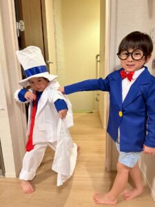 保育園でハロウィンの仮装があるとのことで息子たちが、コナンとキッドになっていました。